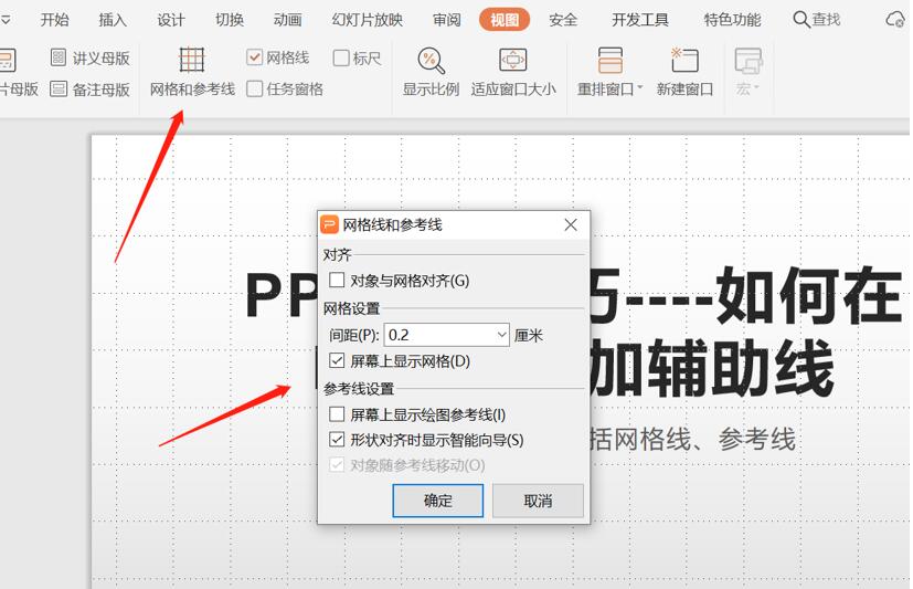 2.当我们需要在PPT中增加辅助线时我们应该怎么做呢?今天,就由小编告诉各位如何在PPT里增加辅助线这一小技巧,大家一起来学习吧!第一步:打开WPS,在【演示】中新建一个空白文档,点击【新建空白文档】;第二步:在文档中点击【视图】选项;第三步:在【视图】中,直接点击【网格线】选项就会出现网格辅助线;第四步:直接双击【网格和参考线】选项,就会弹跳出如图页面的第一种辅助线网格线;第五步:取消【屏幕上显示网格】,选中【屏幕上显示绘图参考线】,最后点击【确认】;第六步:点击确认后出现了第二种辅助线参考线
