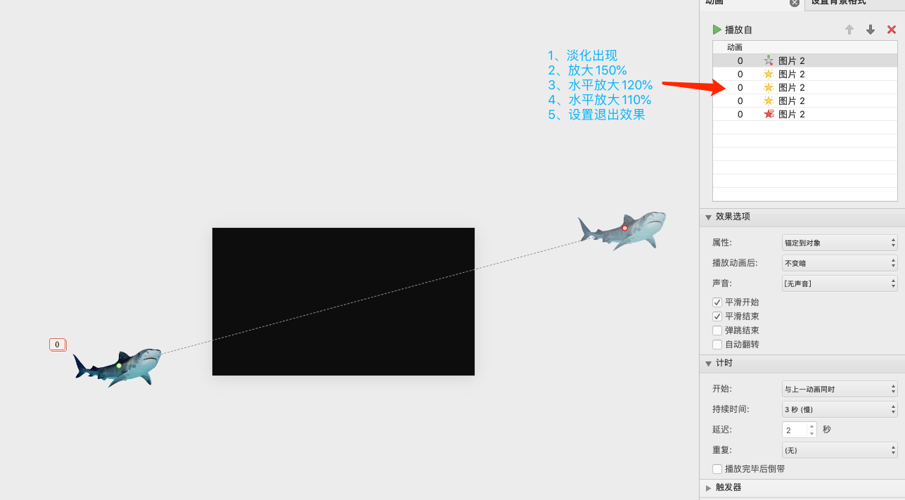 动画效果「叠加」的使用,其实还能做出很多东西。比如,你只需要一张静态的PNG图片,就可以作出运动的效果,比如下面这个鲨鱼: