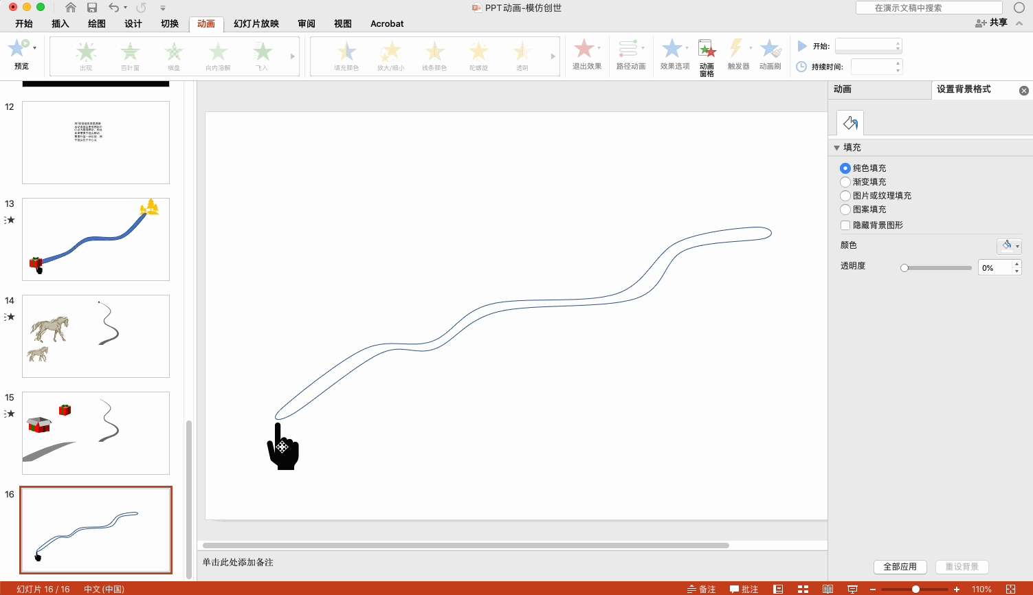细心的你,可能发现了,并非手指头,而是手掌心沿着这条路径运动,这是因为路径运动是以图片中心为基准的,为了方便,我们可以让手形和一个无填充矩形组合在一起,这样就是沿手指头运动了。就像这样: