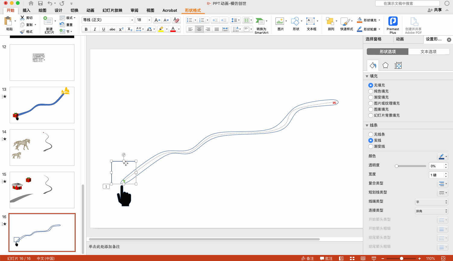 至于这个手绘效果,则是小路形状的擦除和手指/礼盒的曲线运动叠加制作而成。
