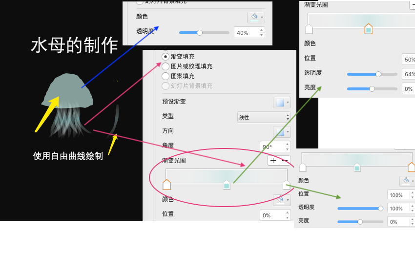 1、素材的准备:水母的帽子状冠和触须,都可以通过自由曲线绘制而成,然后对它们的填充颜色和透明度做一定调整即可。