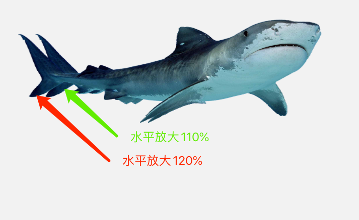鲨鱼的摆动,是叠加了两个水平放大效果(放大倍数有差异);马屁的走动效果则是因为用了两张不同形态和位置的走动图,交叉显现和同时做直线运动。