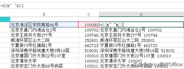 在"D2"单元格输入"B2"中的地址和"C2"中的邮编,中间根据实际需要可加空格等分隔符号或不加任何符号,回车后按"Ctrl+E",即可把地址和邮编合并到D列。