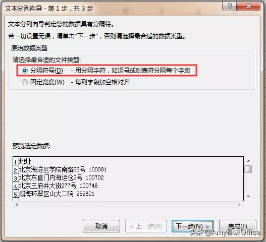 A列中的地址和邮编中间是用空格分开的,所以文件类型我们选择“分隔符号”。