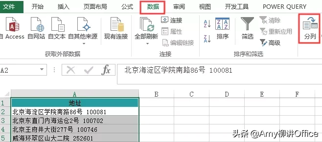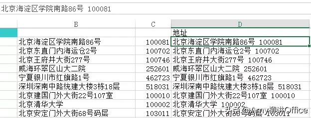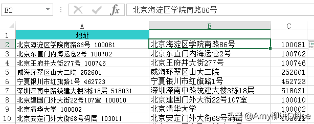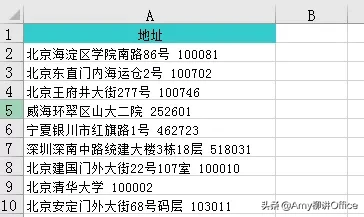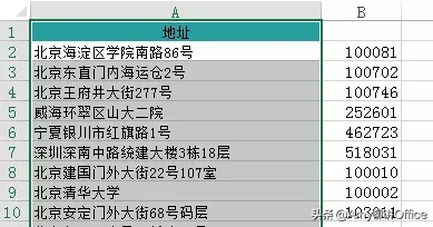 数据表中的地址和邮编已经拆分开,邮编分到了B列。