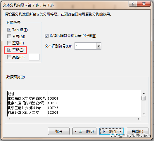 在【第2步】中,【分隔符号】处勾选“空格”,在【数据预览】处可以看到地址和邮编之间有一条竖线,说明已经分开。