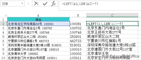 第二个参数 LEN(A2)-7 , 其中LEN(A2)是计算 "A2" 单元格中的字符数一共是多少,用整个"A2"单元格的字符数减去6位邮编和1位空格,一共减去7个字符,剩下的就是从左边提取的字符数,也就是地址了。