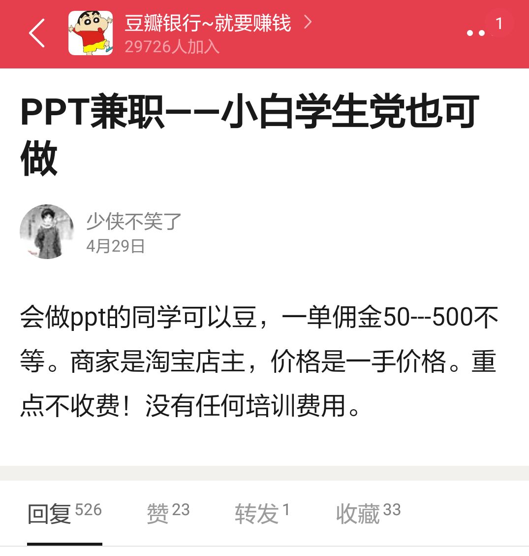 在豆瓣搜索“PPT兼职”出现许多淘宝店招募帖