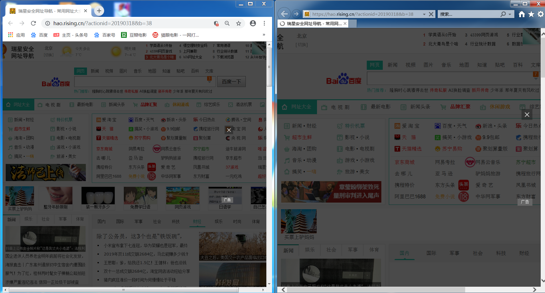 就在我安装完这两款软件并把原杀毒软件退出之后,电脑突然变得明显卡顿起来,一件有趣的事情发生了:我的Chrome和IE浏览器主页都被瑞星杀毒劫持了,最骚的是瑞星主页还被一个显示不出来的巨大广告给遮住了。