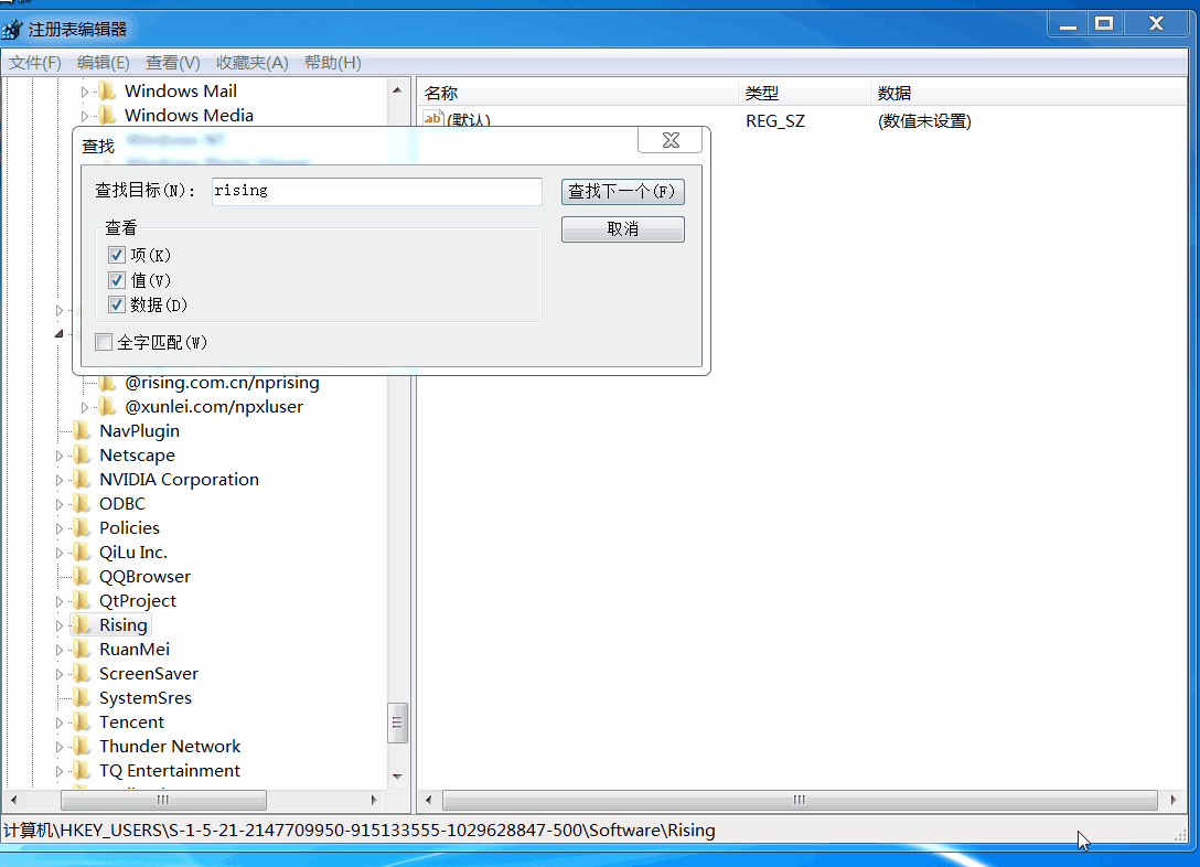 第三步:删除注册表残留文件,依旧是按照关键词搜索,凡是相关的统统删除。(切记删除注册表时看清楚文件名,删错了很可能会导致系统崩溃)