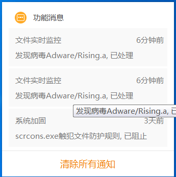 单单是在安装过程中,我电脑上附带的杀毒软件就已经扫描出两个广告病毒文件,怀疑这两个文件是弹广告的罪魁祸首。如果您的电脑上有瑞星,不妨搜索一下这两个名为Rising.a文件并删除。
