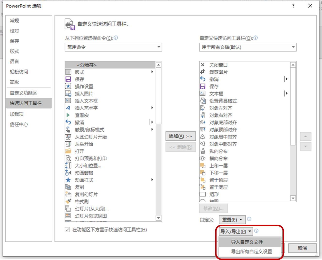 在快速访问工具栏添加的页面,右下角有一个导入导出,可以导入别人保存好的工具栏,也可以导出自己设置好的工具栏。
