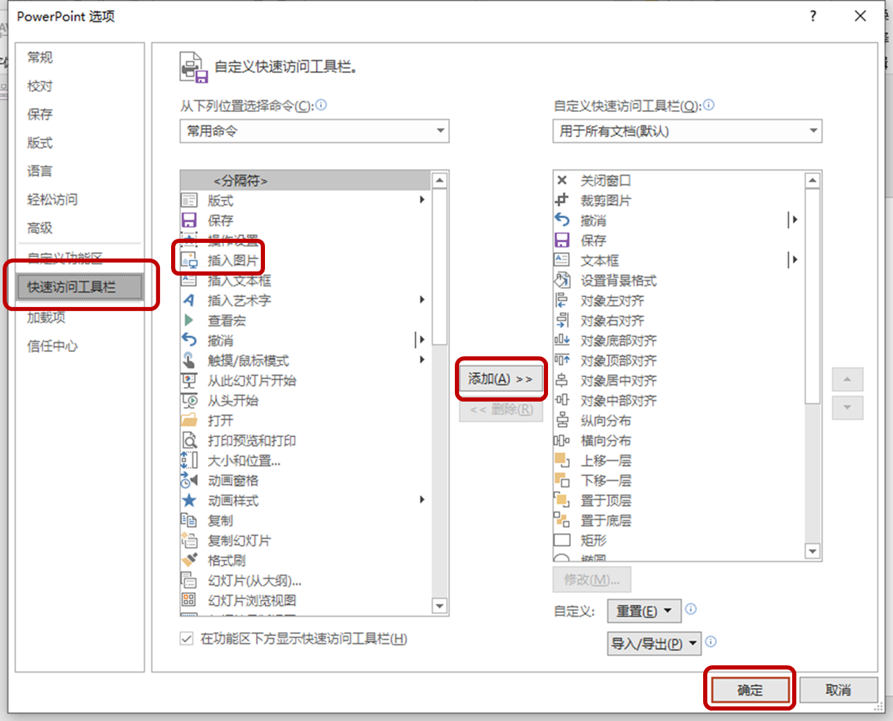 方法1:点击文件-选项-快速访问工具栏-选择要添加的工具-添加-点击确定。