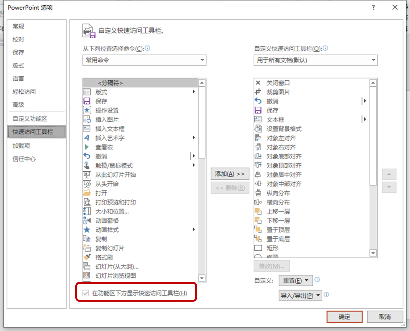 在方法1的最后一个界面,在常用命令菜单下面有一个特殊的按钮"在功能区下方显示快捷访问工具栏",如果需要在下方显示,勾选就行,我的就是勾选过的。