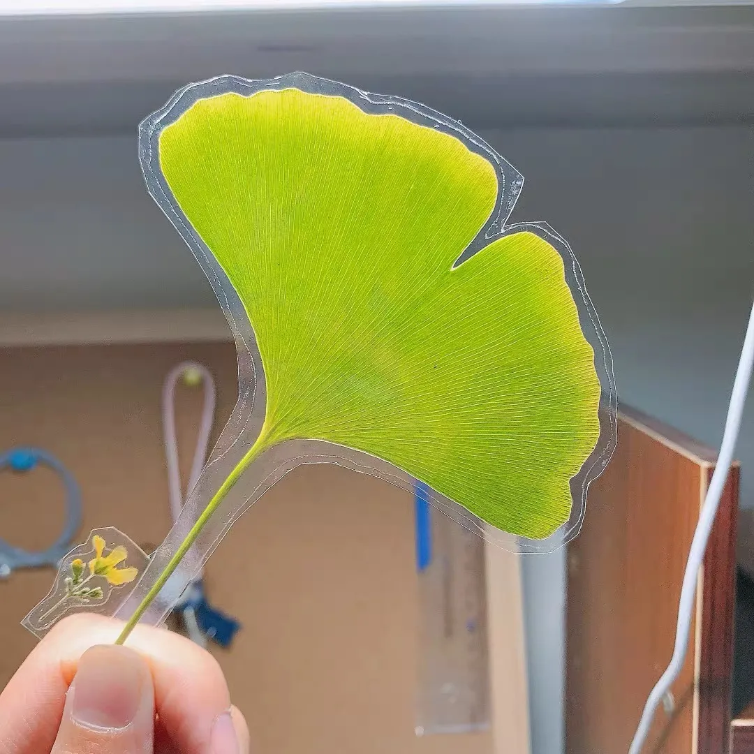 ④将红绳穿过塑封膜已打好的孔,书签就做好啦!