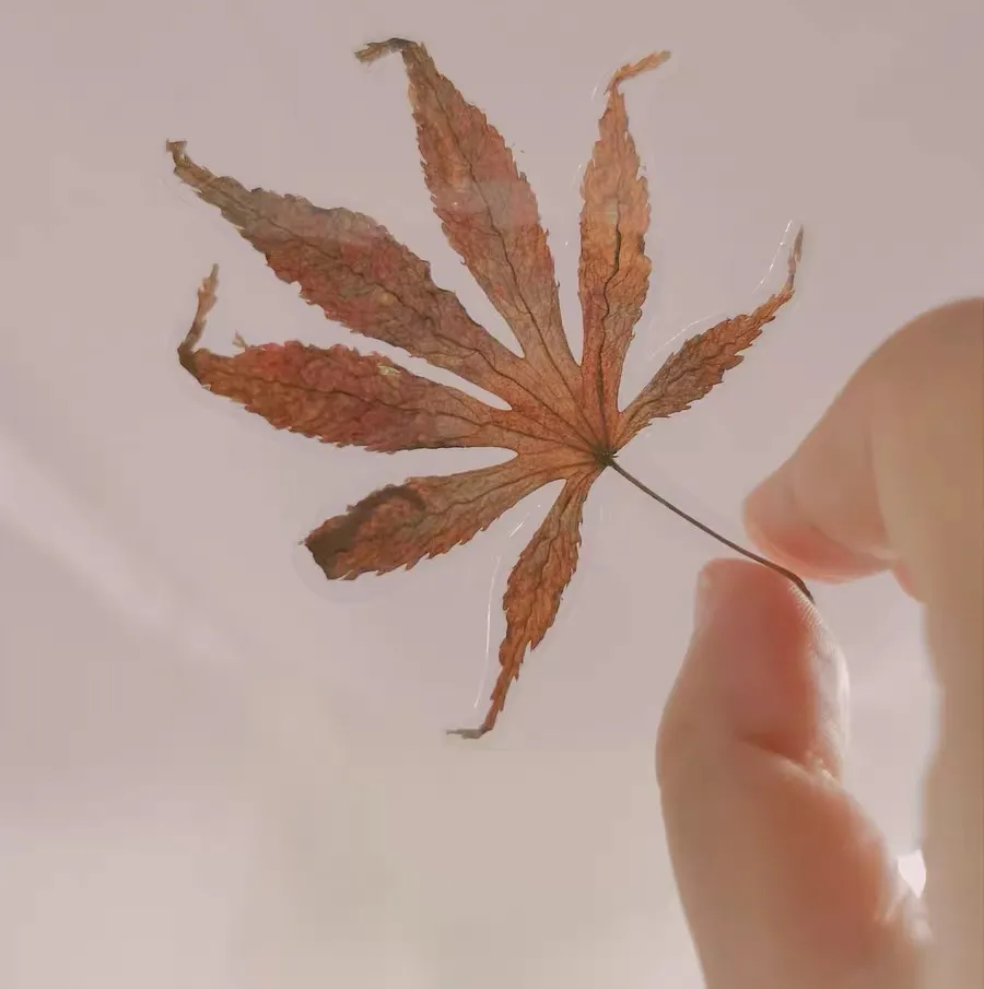 孩子们采集的各种不同的树叶、打孔后的塑封膜、剪刀、红绳。