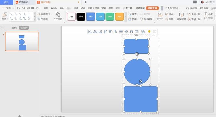 2.首先打开需要对齐的PPT,可以看到里面的形状完全没有次序:接下来我们用shift+鼠标键选中需要对齐的形状