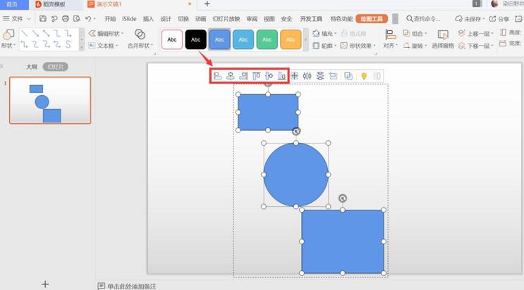 3.可以看到上方跳出一个小的菜单栏,我们可以根据自己的需要选择左对齐、水平居中、右对齐、向上靠齐、垂直居中、底部靠齐等多种对齐方式:我们选择好一种对齐方式就可以看到PPT瞬间变得整洁起来了: