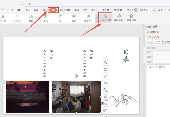 5.第四步,同样的选取另一张图片后点击【动画】-【自定义动画】