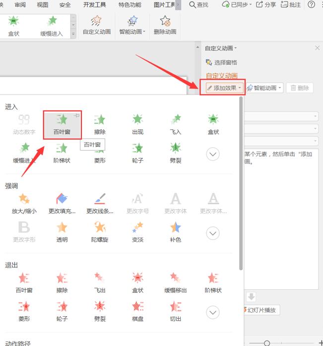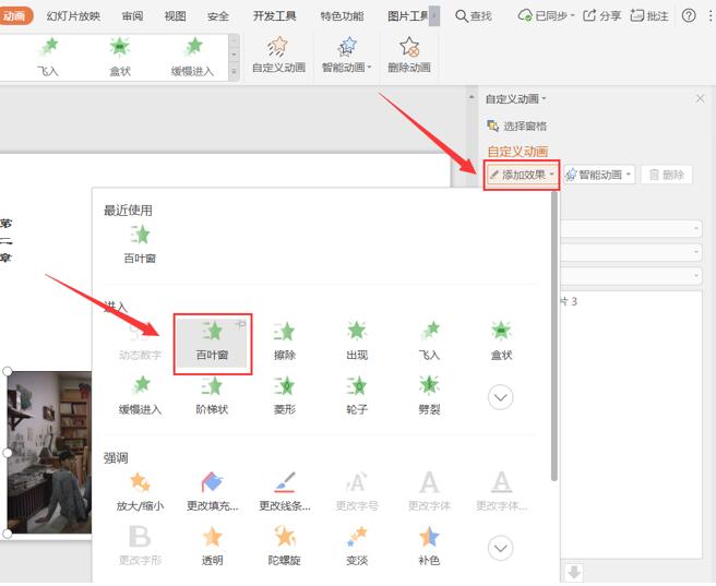 6.第五步,在自定义动画的菜单栏中点击【添加效果】,选择动画效果