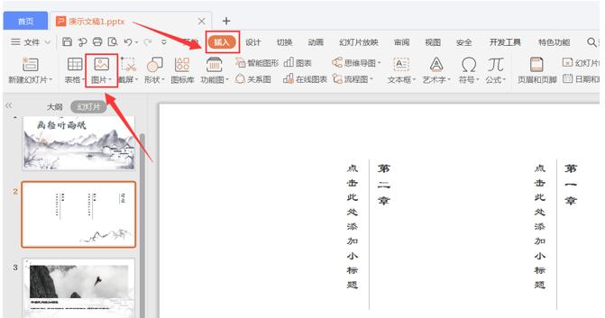 2.第一步,在菜单栏中选择【插入】-【图片】。