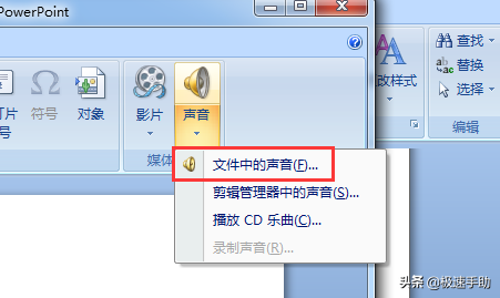 第三步,在出现的下拉菜单中选择【文件中的音频】,这时候会弹出【插入声音】对话框,选择已经准备好的音乐文件,点击选择添加进来即可。