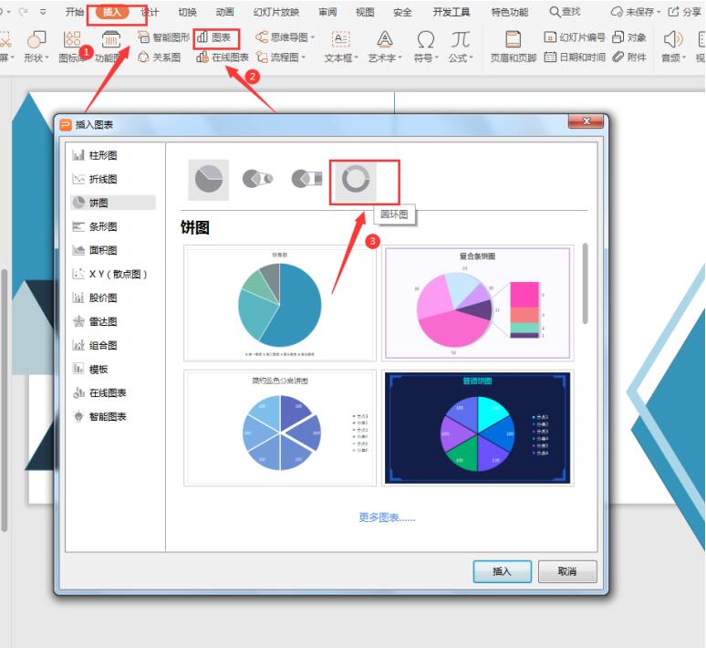 1.我们日常在制作PPT时,会通过插入不通的图表来体现数据。