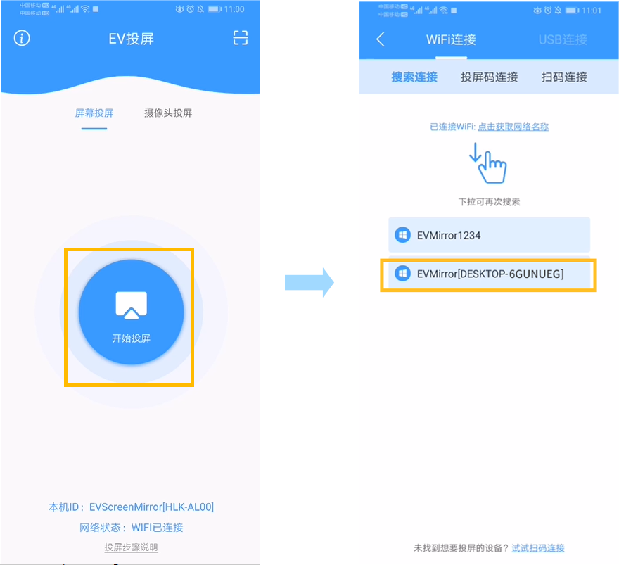 2.电脑打开EV投屏桌面端等待连接,手机打开EV投屏APP搜索设备进行连接。