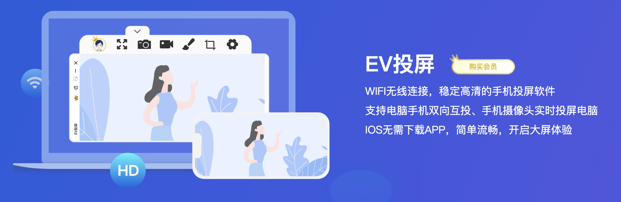 EV投屏是一款非常出众的手机投屏软件,不仅支持安卓手机投屏电脑,也支持苹果手机投屏。在投屏中还有多种投屏小工具可以增加用户体验。