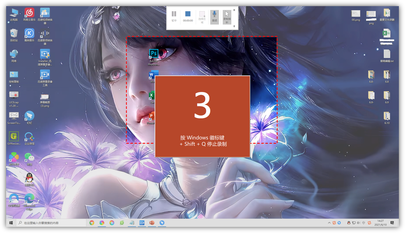 接下来点击「录制」按钮,开始录屏,只能录制红色虚线框以内的画面,如果不想录制了,按下快捷键「Win+Shift+Q」,即可停止录屏。