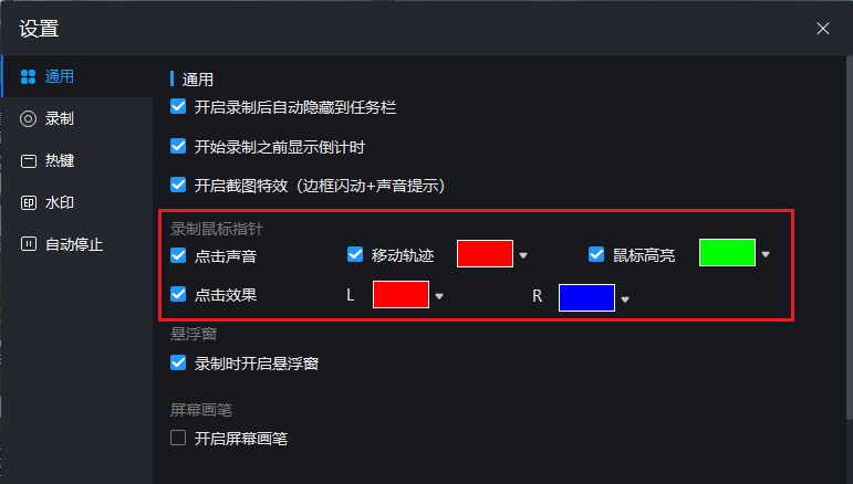 同时还可以给鼠标指针开启声音和效果,如果你开启了系统声音录制,视频中就能听到鼠标点击的音效!