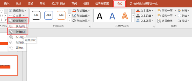 6.3 合并形状把文字和形状一起选择(可以按住Ctrl,然后鼠标一个一个点击选中),点击 “格式” >> “合并形状” >> “组合”