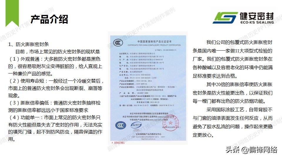 (3)膨胀倍率偏低:普通防火密封条抽样检测的膨胀倍率都远远小于国家标准要求。本文章来自偏锋网络PPT制作策划产品推介案例。