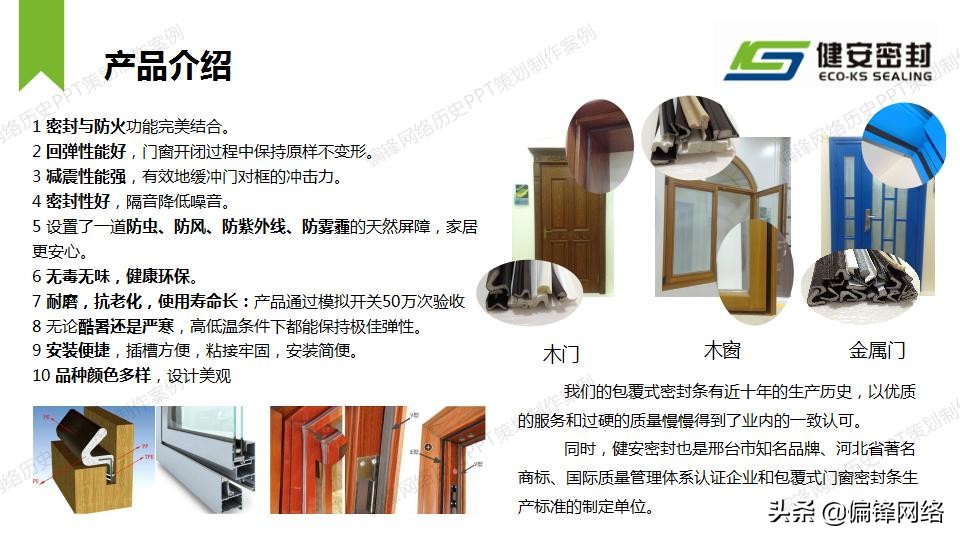 我们的包覆式密封条有近十年的生产历史,以优质的服务和过硬的质量慢慢得到了业内的一致认可。本文章来自偏锋网络PPT制作策划产品推介案例。