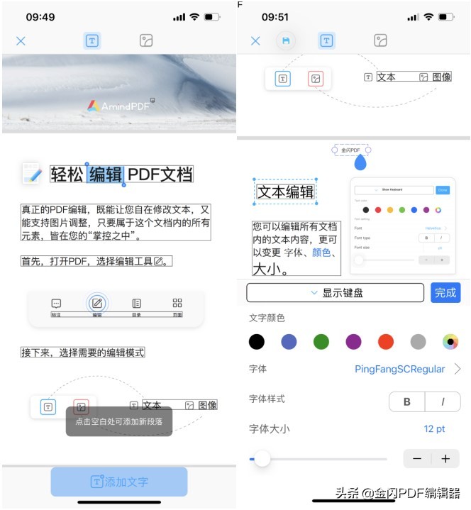手机用户:打开PDF文件后,点击页面底部的“编辑”按钮,进入到PDF编辑界面,点击底部“添加文字”按钮,再点击文中需要添加文本的空白处添加文本;
