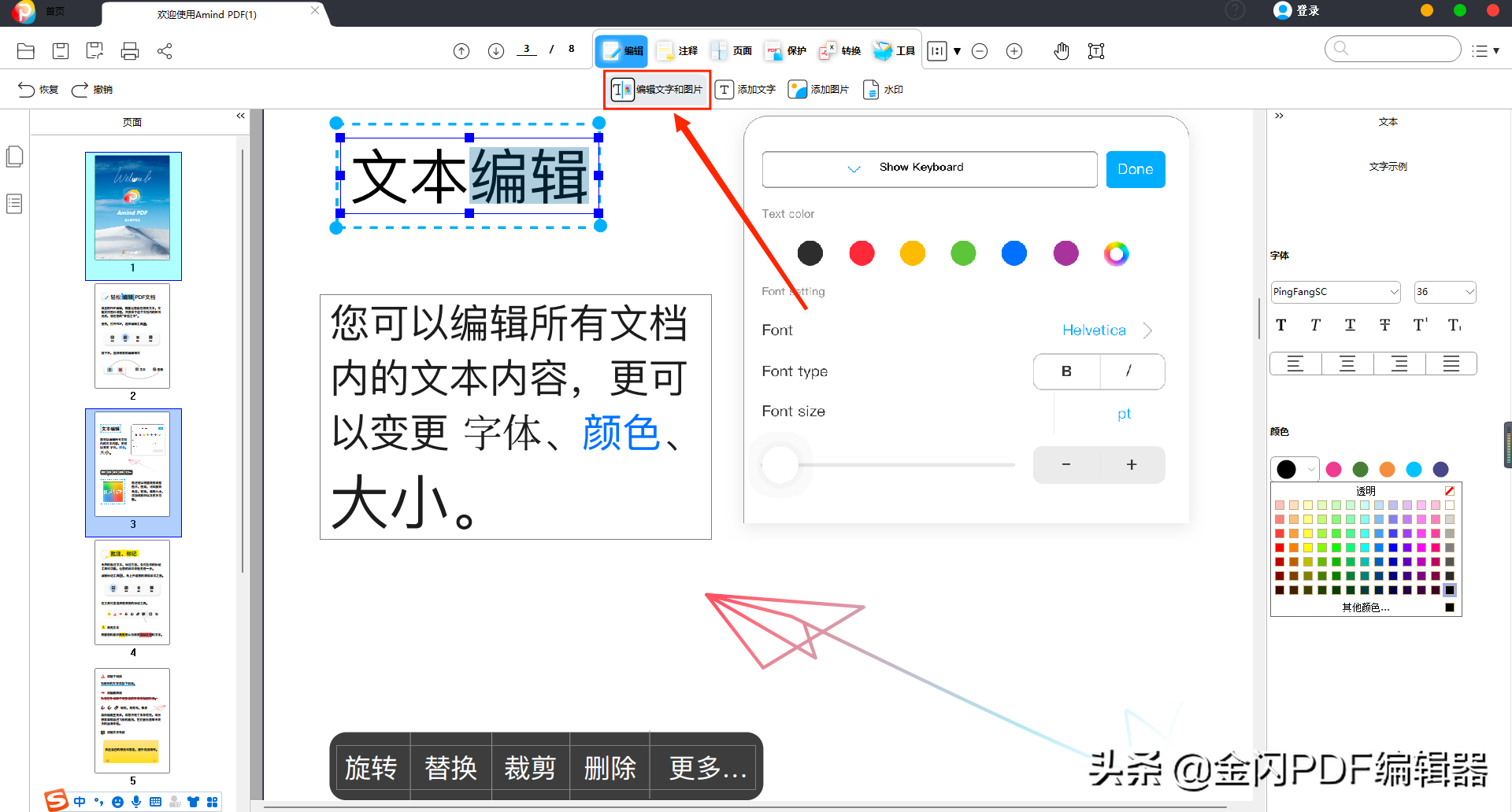 金闪PDF编辑器是一款最新的PDF编辑工具,主要有移动端安卓和IOS,PC端Windows两个版本,无论你是手机用户还是PC端用户,都可以通过金闪PDF编辑器轻松编辑和修改PDF文件,不仅如此,你还可以在阅读PDF文件的同时给PDF文件添加各种注释、PDF加密或解密、PDF添加水印、PDF扫描文件文本识别为可编辑文件、PDF合并和拆分、PDF创建、PDF页面管理、PDF转换成Word、Excel或PPT和各种类型的图片等等,下面我们就主要介绍一下金闪PDF编辑器如何插入可编辑文字以及编辑文字的详细操作步骤。