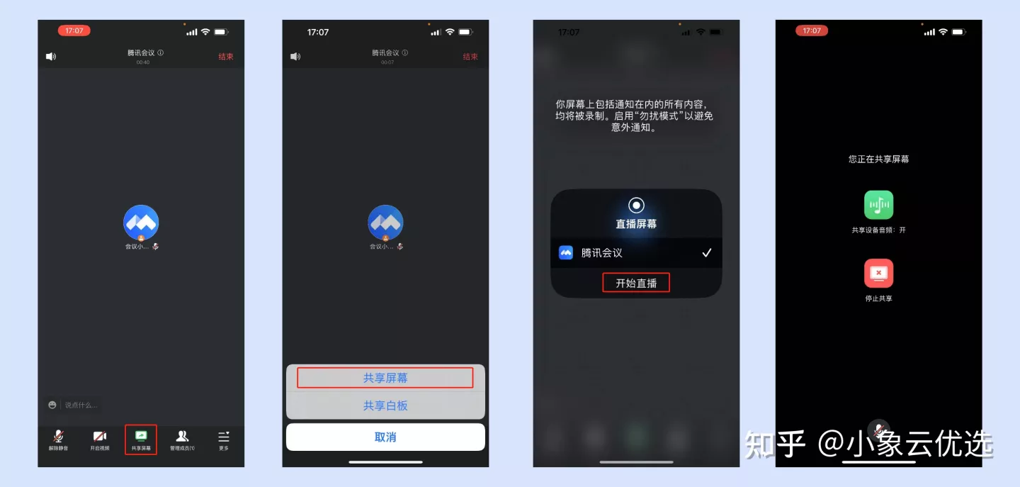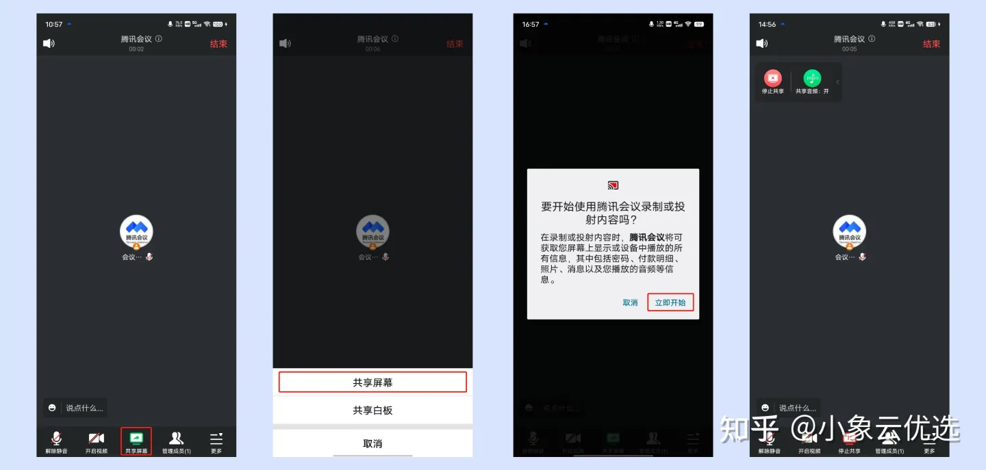 ①会中点击底部工具栏【共享屏幕】->选择共享内容,并点击确认共享,即可开启屏幕共享。
