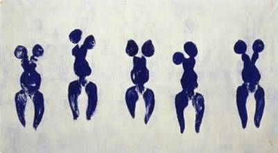 《蓝色时代的人体测量》是克莱因的另一件作品。1960年3月的某一天,克莱因在巴黎的当代艺术画廊,在3位人体女模特身上涂上克莱因蓝。然后让她们在画布上翻滚,将身体形态在画布上留下永远的印记。现场还演奏了克莱因创作的《单调交响曲》。