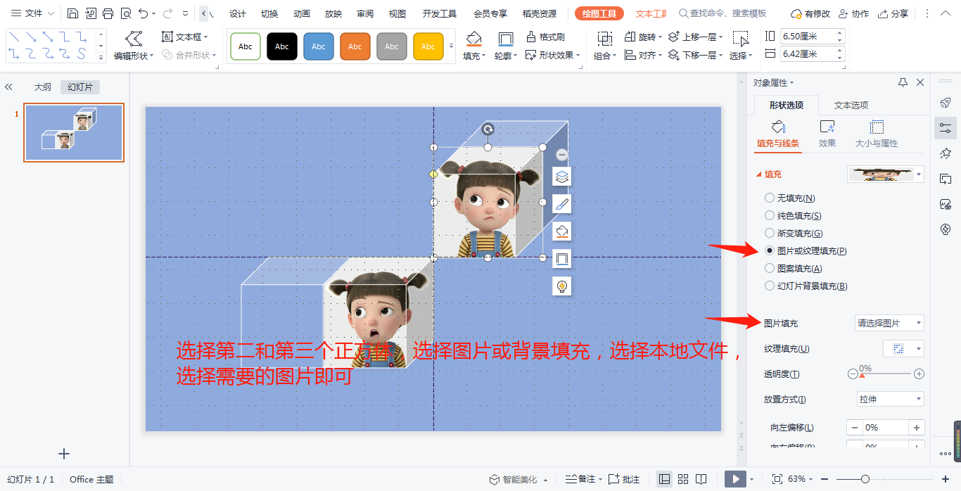 5,选择2,3正方体,-图片或纹理填充-图片填充-本地文件-选择需要呈现的图片即可。