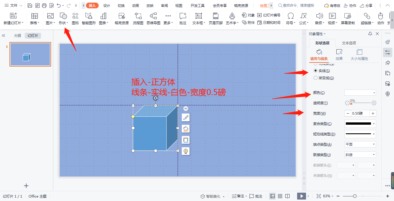 2,插入-形状-正方体。按住shift键可以得到一个正方体。