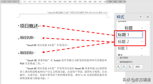 完成这些设置后,确认关闭。我们已经能看到文档中标题已经发生了变化,编号已经按照预期样式,显示在了原来的标题前面,同时,样式窗格中也可以预览到这些样式的效果。