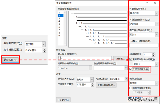 为了使后续编号呈现1.1……,1.1.1……等正规数字格式,我们需要把定义新多级列表的隐藏区域打开,进行进一步设置。打开隐藏区域的方法是点击,对话窗左下角的“更多”按钮,在出现区域中选择“正规形式编号”复选项。