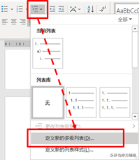 选择“开始”选项卡中“段落”工具区上的“多级列表”菜单。在菜单中找到“应以新的多级列表”命令。
