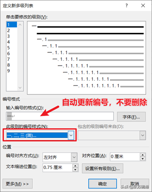 本文关键要解决的是将编号与样式绑定,下面继续在多级编号对话窗中进行设置。