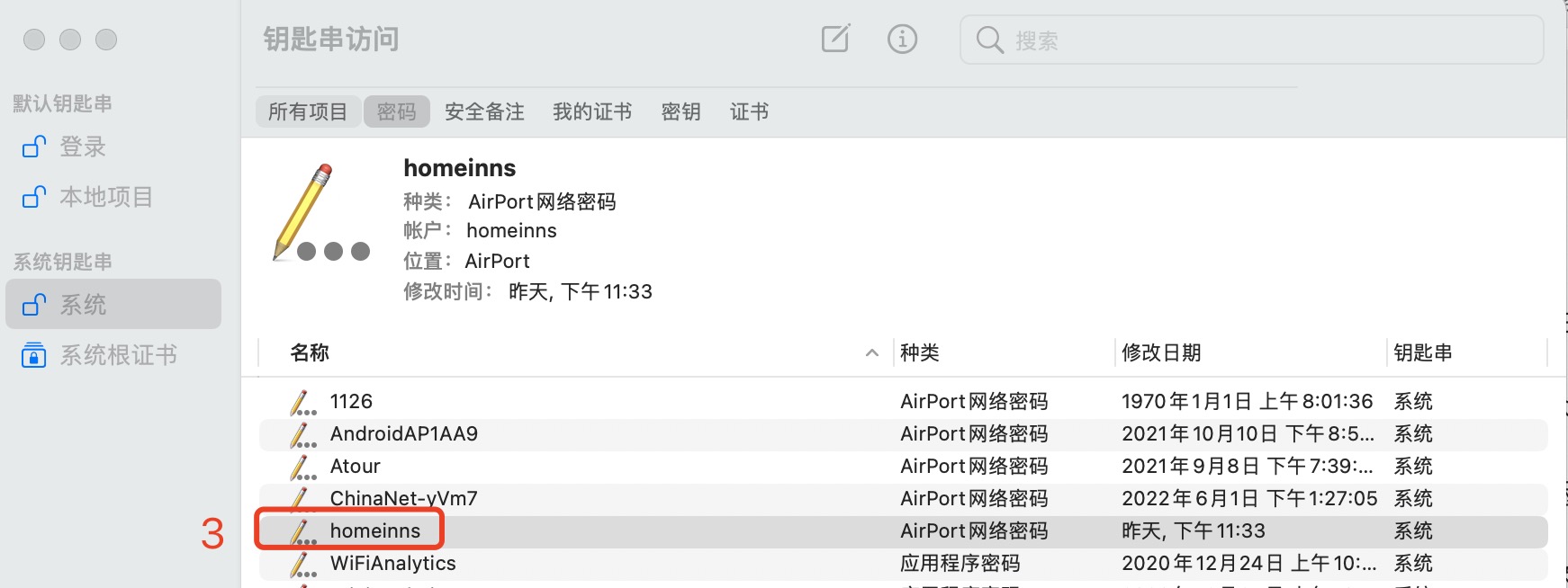 点击访达,在搜索里面输入钥匙串访问,点击钥匙串访问,找到系统,然后点击需要连接的Wi-Fi,点击显示密码,这时候需要输入用户名和密码,输入后wifi密码就显示出来了.
