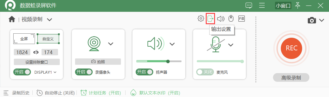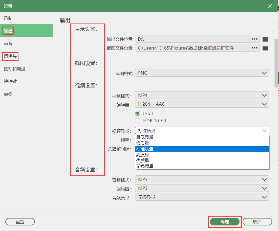 步骤2:将数据蛙录屏软件打开运行,点击“视频录制”模式;同时打开“视频录制”模式右侧的“输出设置”功能,根据个人录制需求对视频进行相关的设置,比如视频格式、视频质量、视频输出位置、音频录制、摄像头等参数设置,能够提高视频录制质量。