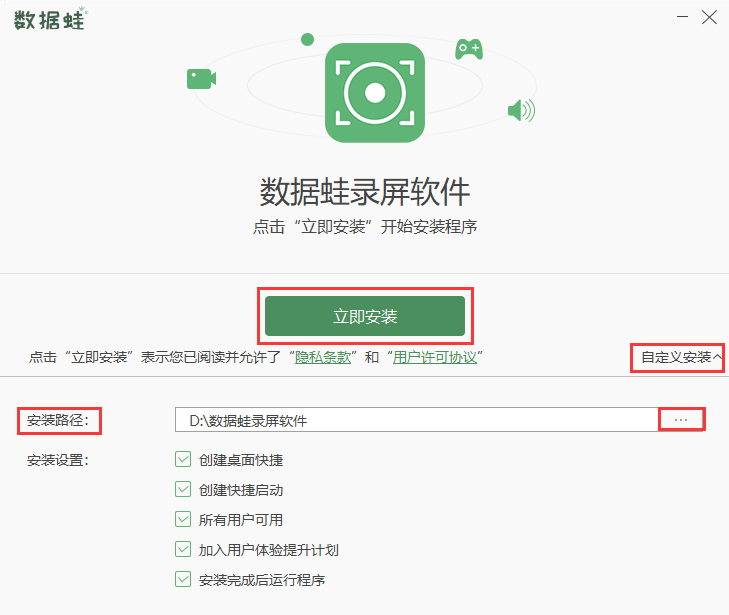步骤1:首先,在数据蛙录屏软件的网页,点击“软件下载”按钮,软件将会自动分配合适您的电脑(Windows电脑和Mac苹果电脑)安装包。然后,将下载好的安装包打开,通过点击“自定义安装”更改软件安装路径。最后,点击立即安装即可。