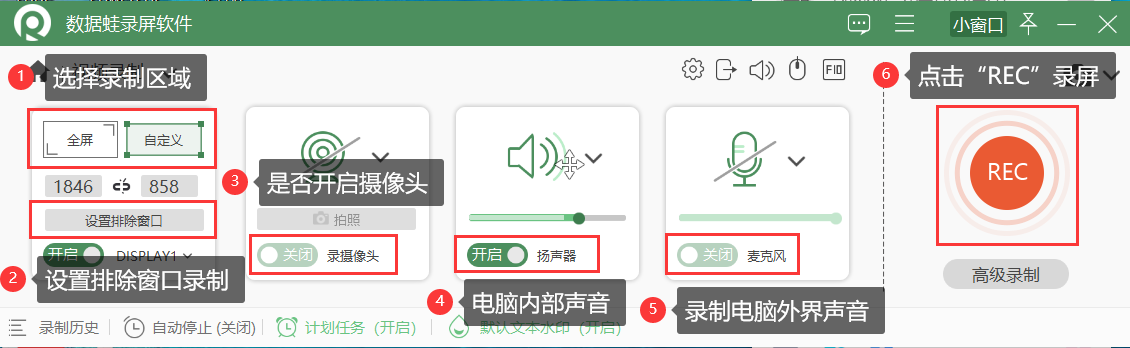 步骤3:在“视频录制”界面,可以选择自定义录制区域(全屏录制或者选择区域录制视频);然后,根据个人录制需求开启扬声器、麦克风声源、摄像头以及设置排除多个窗口录制;如果这是录制PPT内容,可以将“摄像头”关闭;如果您想录制真人出境讲解视频内容,可以将“摄像头”开启,并在录制视频前,调整“摄像头”的大小以及位置;最后,将相关设置弄完后,可以点击最右侧的“REC”开始录制PPT视频。