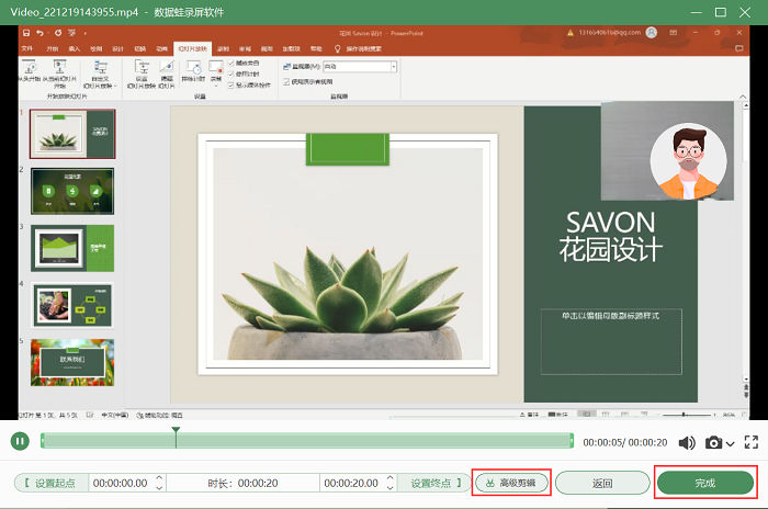 步骤5:结束PPT视频录制后,可以在“预览窗口”观看录制好的视频。确认视频录制好的视频无误后,点“完成”将视频保存下来;如有PPT视频录制后期剪辑的需求,可以点击“高级剪辑”进行简单的分段、淡入、淡出后期处理;