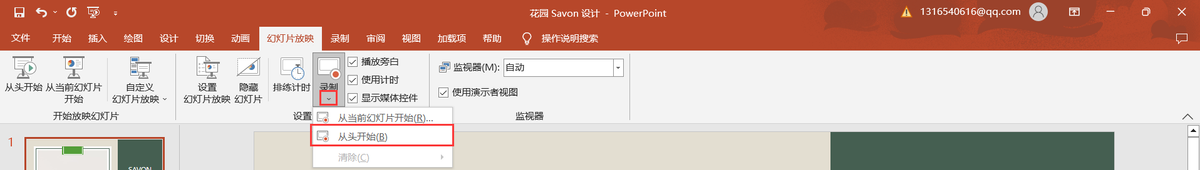 步骤2:在“幻灯片放映”的工具栏选项中点击“录制”下方的“三角形”列表中的“从头开始(B)”,即可从PPT演示文稿第一页录制视频;